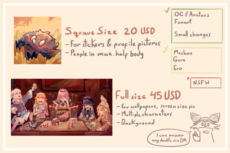 (Traditional ones cannot be changed very much after the sketch since they're handmade :'})- More than one character may increase the price!- I love little creatures! If you ask me to add one to your artwork, I'll do it gladly. OwO
